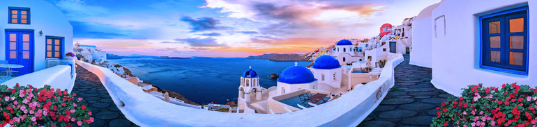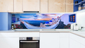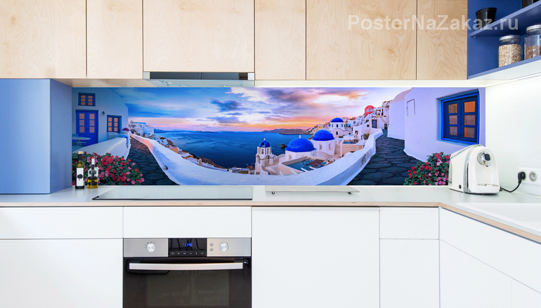 Наклейка с изображением панорамы прибрежного городка с прекрасным закатом, узкими улочками и видом на океан будет отлично смотреться в виде кухонного фартука.