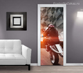 Наклейка на дверь с изображением мотоциклиста, стремительно мчащегося в даль, на фоне лучей заката и гоночного флага