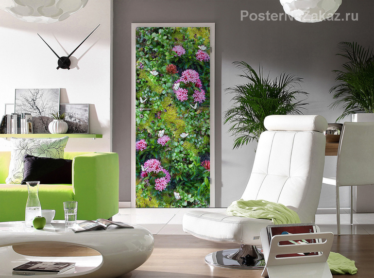 Наклейка на дверь с изображением зеленого покрывала из цветов, листиков и мха с порхающими бабочками придаст комнате уюта и ощущение единения с природой.