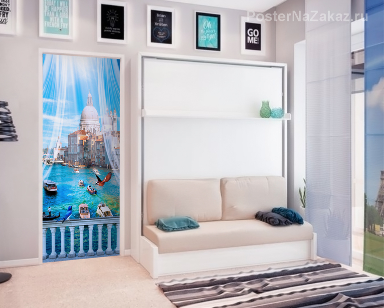 Наклейка на дверь с изображением одного из каналов прекрасной Венеции с туристическими катерами и лодками будет отлично смотреться в гостиной.