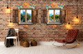 Наклейка в виде пары окошек с красивым орнаментом сверху и снизу рам и деревянными ставнями будет отлично смотреться в любой комнате.