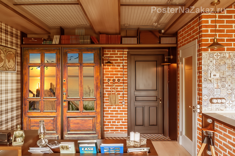 Наклейка на шкаф купе в виде старинных дверей с окошками и видом на закат около реки, прекрасное дополнение к оформлению интерьера комнаты.