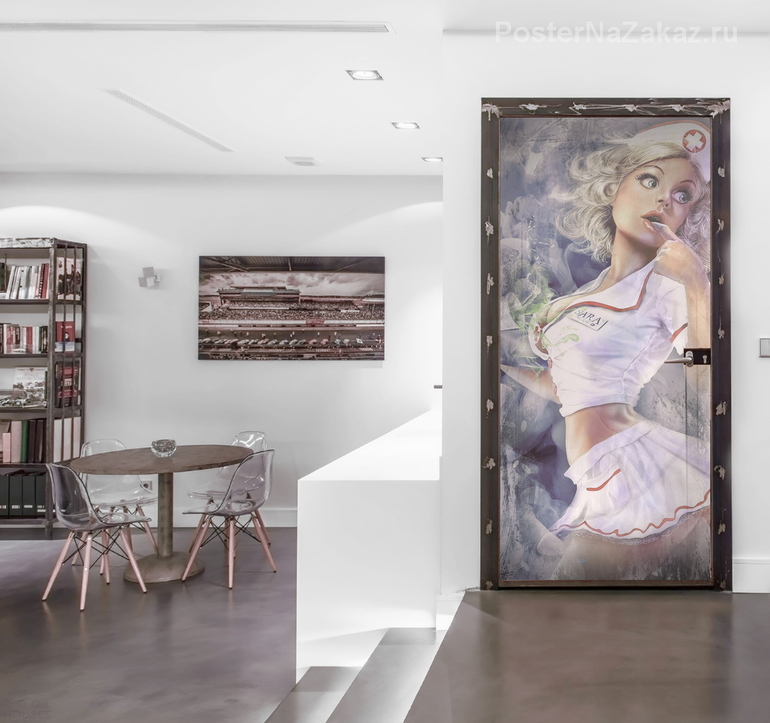 Наклейка с изображением сексуальной блондинки в форме медсестры будет отлично смотреться на двери в мужской комнате.