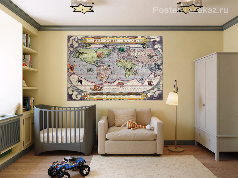 Древняя карта с нанесенными на нее мифическими существами привнесет в вашу комнату элемент тайны и приключений. Это альтернативный мир, который будет способствовать включению вашего воображения.