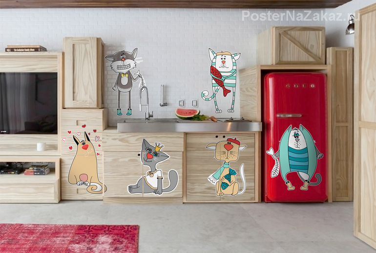 Наклейка, состоящая из коллекции забавных котов, с рыбками, сердечками и галстуками-бабочками, будет отлично смотреться как на стене, так и на кухонных шкафчиках и холодильнике.