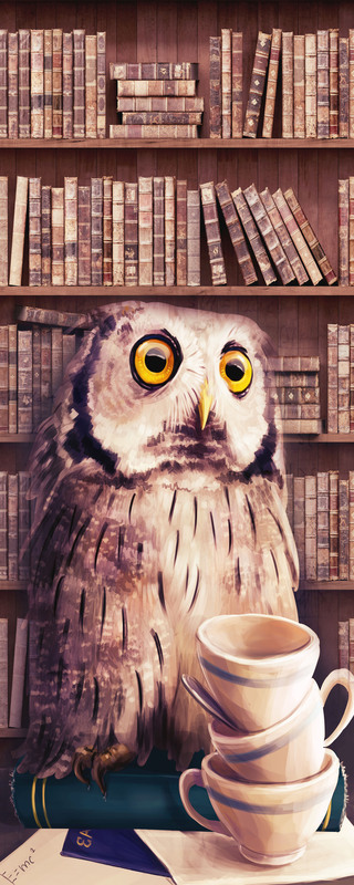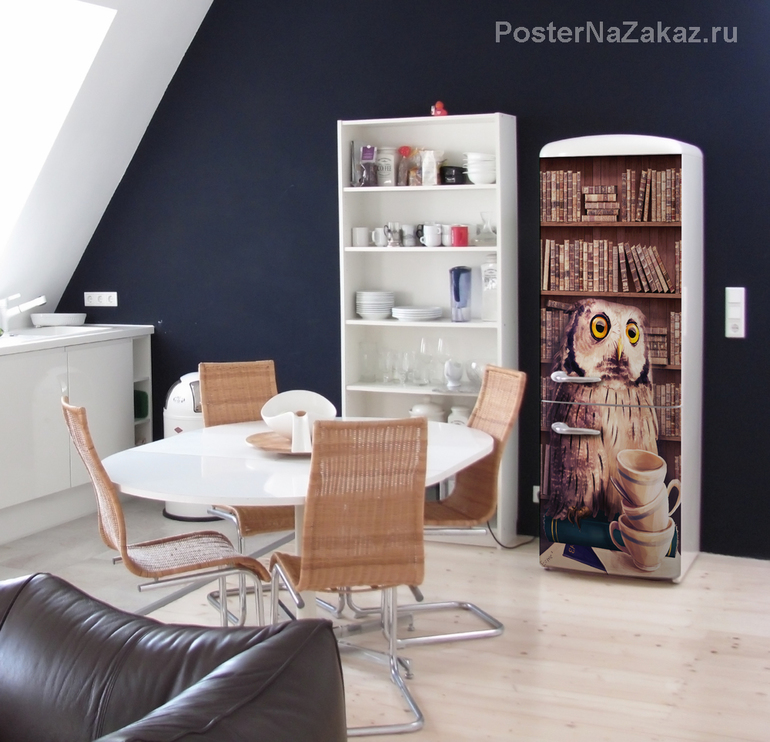 Наклейка на холодильник с изображением забавной совы с кружками кофе на фоне книжных полок украсит любой интерьер комнаты.