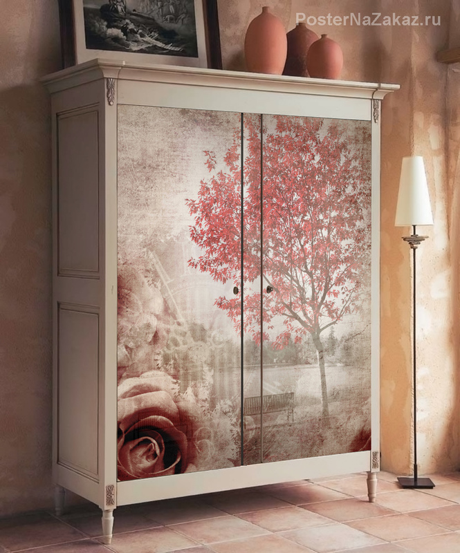 Наклейка с изображением дерева с красной кроной листвы около озера с лавочками, в окружении роз, украсит ваш шкаф.