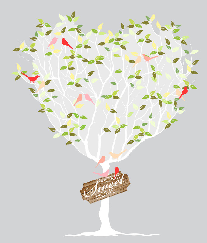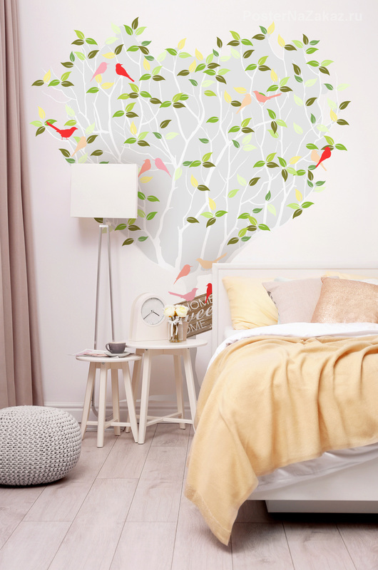 Наклейка в виде дерева с кроной в виде сердца, птицами, листочками и табличкой с надписью "Дом, милый дом" станет украшением вашей спальни.
