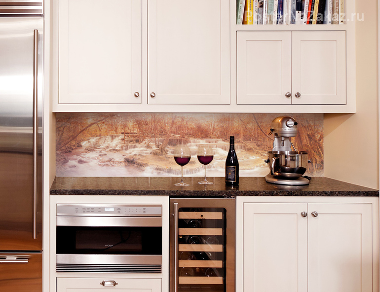 Наклейка с изображением небольшого водопада в сердце леса в золотое время года будет отлично смотреться на вашей кухне.