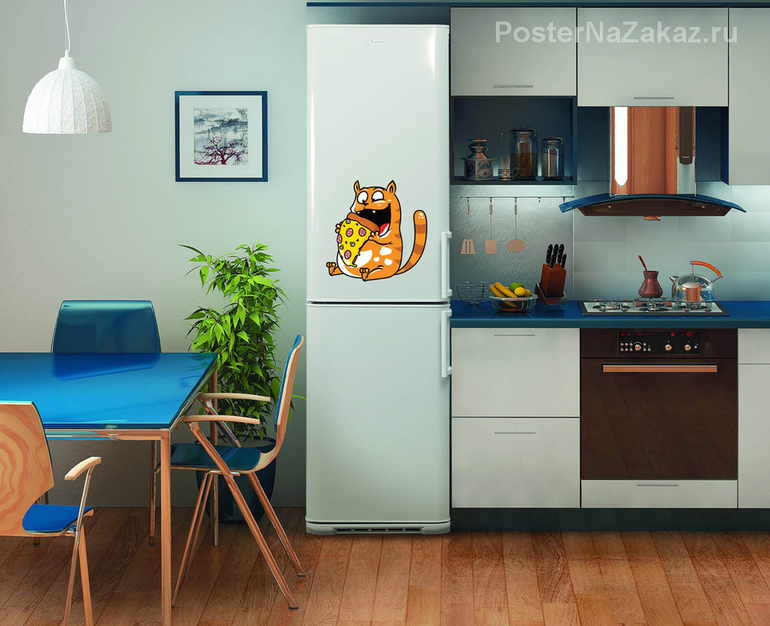 Кот-обжора, аппетитно поглощающий пиццу, займет почетное место на вашем холодильнике или на стене кухни.