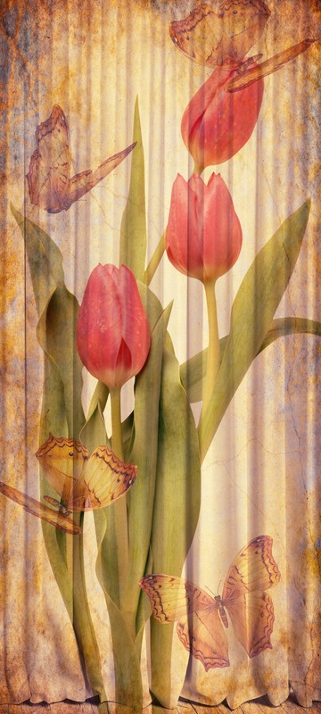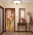 Наклейка с изображением букета из красных тюльпанов с порхающими бабочками и эффектом штор украсит вашу прихожую.