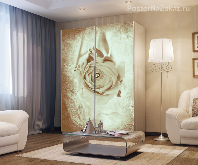 Изображение восхитительной бежевой розы на фоне витиеватого рисунка будет прекрасно смотреться в вашей гостинной.