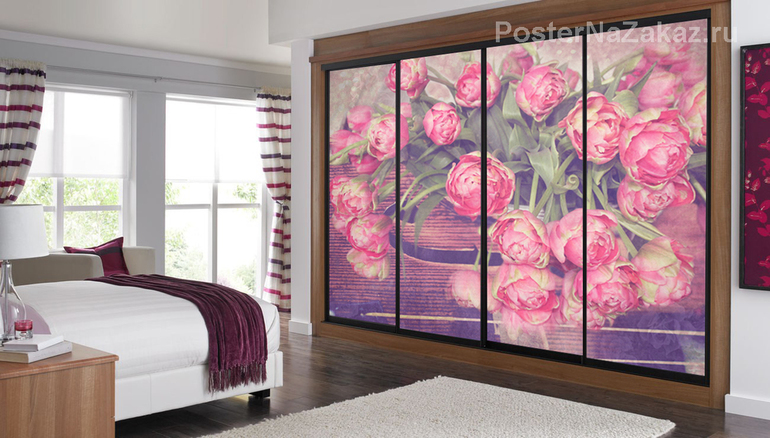 Изображение в интерьере тюльпанов на фоне скрипки добавят вашей комнате изысканности и музыкальности.