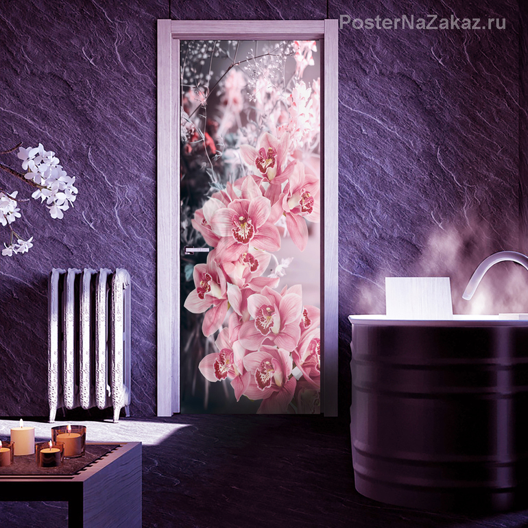 Наклейка на дверь с изображением цветущей веточки орхидеи, отличное дополнение к оформлению Вашей комнаты
