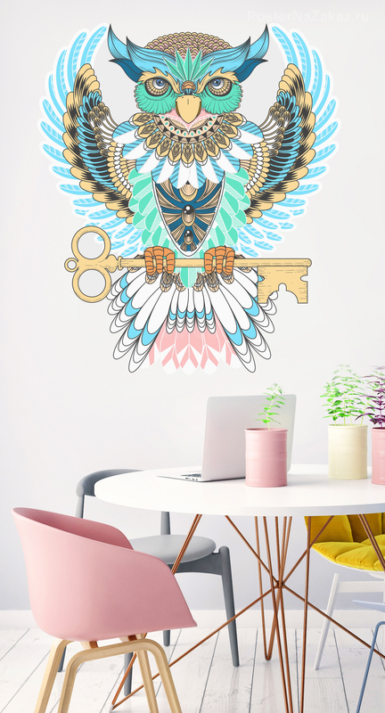 Наклейка с изображением яркой разноцветной совы с золотым ключиком станет главным украшением вашей кухни.
