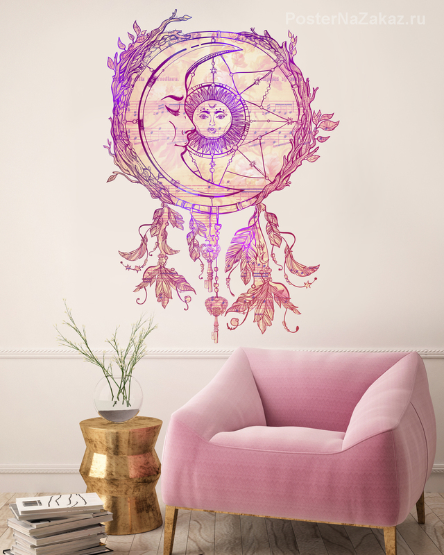 Наклейка с изображением талисмана в виде ловца снов с перьями, листьями и луной станет главным украшением вашей комнаты.