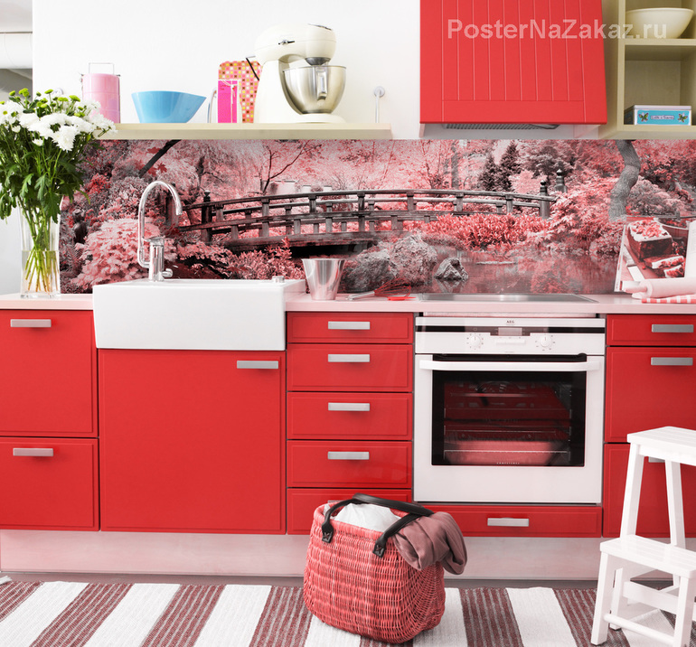 Наклейка с изображением цветочного китайского сада с мостиком через пруд будет отлично смотреться в вашей кухне.