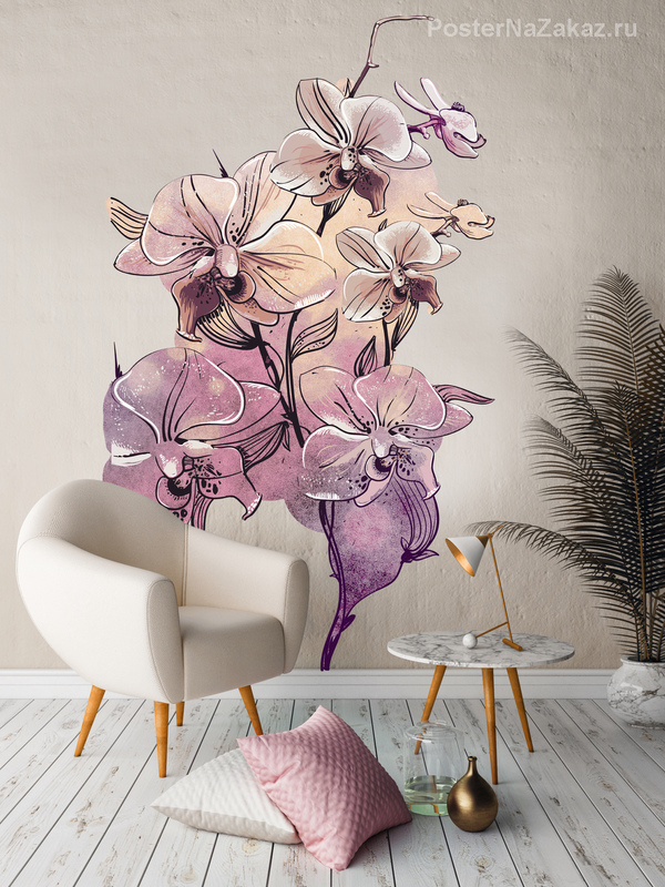 Наклейка с изображением веточки ярко-розовой орхидеи на абстрактном фоне станет главным украшением вашей комнаты.
