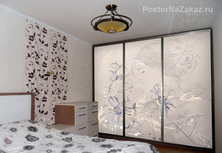Наклейка с изображением девушки с голубыми маками будет гармонично смотреться в светлом интерьере спальни.