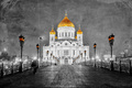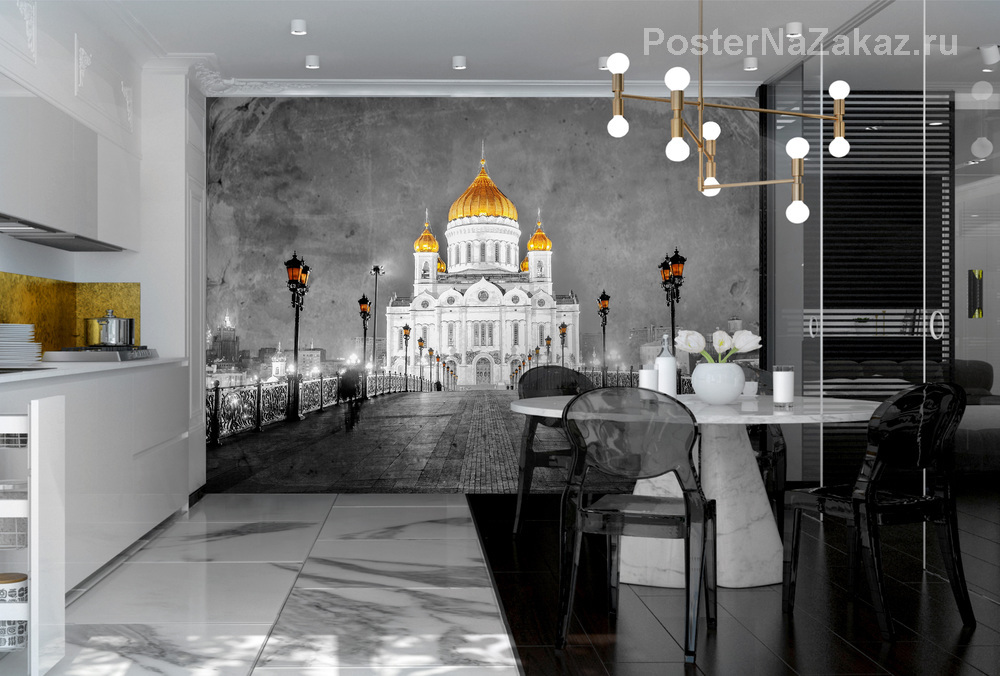 Изображение белоснежного Храма Христа Спасителя с мостом и фонарями в Москве, Россия, в ночное время отлично подойдет для кухни.