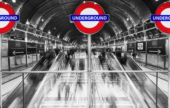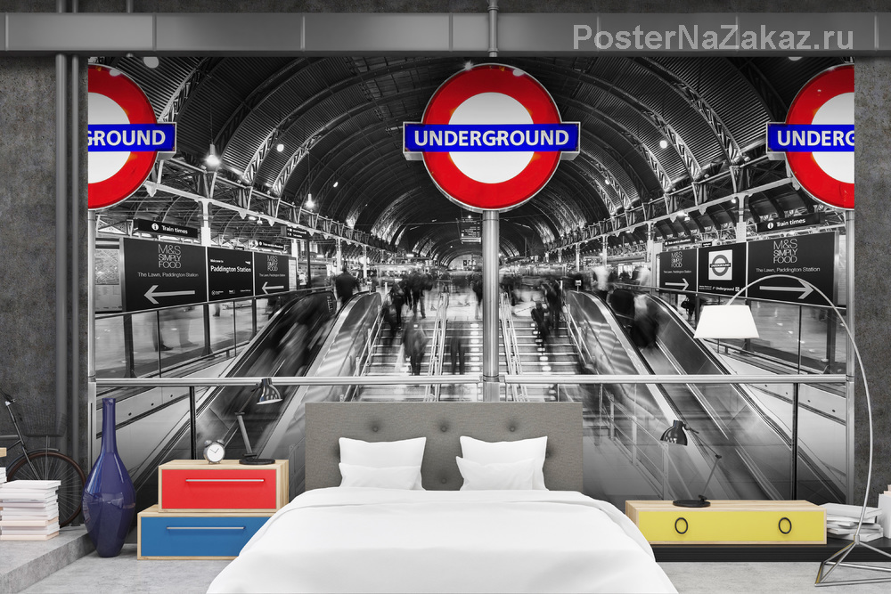 Изображение в интерьере Метрополитена с эскалаторами и предупредительными знаками в черно-белых тонах отлично подойдет для спальни.