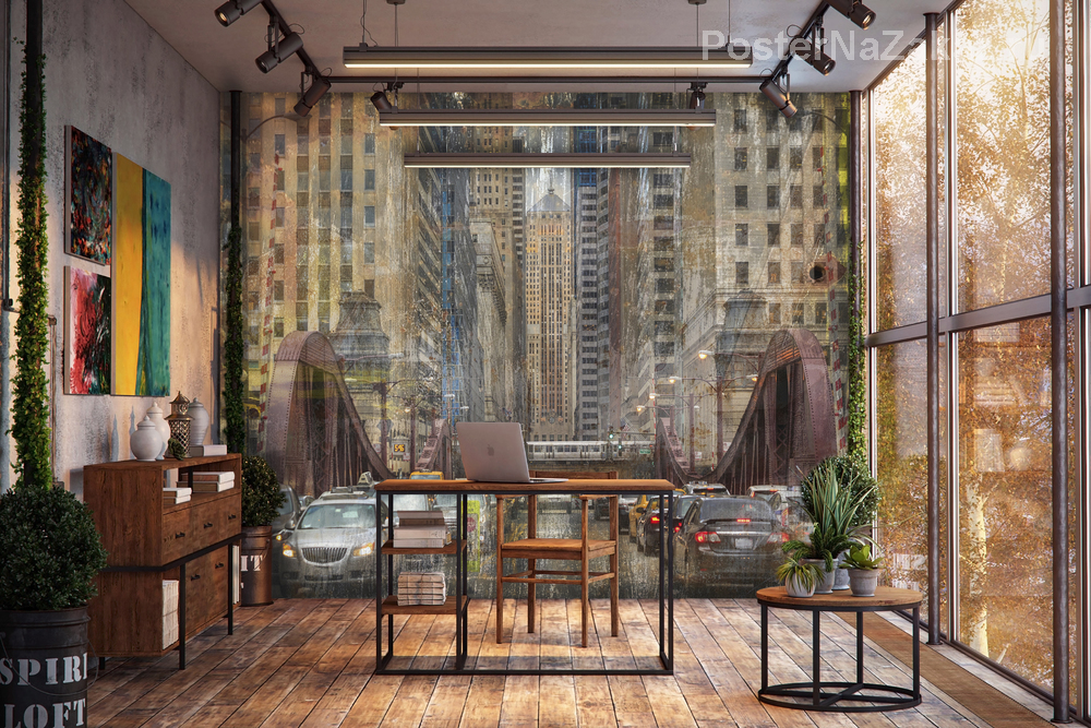Фотообои с различными высокими зданиями, городской суетой машин и людей, в приглушенных тонах, прекрасное дополнение к оформлению вашей комнаты.
