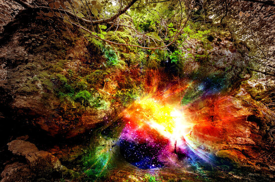 струящиеся космические волны из каменной арки в лесу отлично впишутся в любой интерьер, особенно в стиле лофт