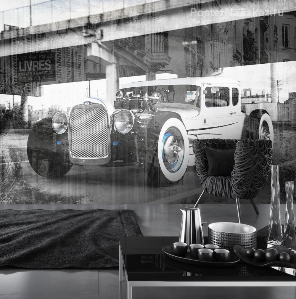 Изображение в интерьере белого ретро автомобиля на фоне городского пейзажа с мостом и улицей отлично подойдет для комнаты в черно-белой цветовой гамме.