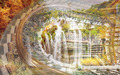 Изображение в интерьере осеннего пейзажа с прекрасными водопадами и винтовой лестницы создаст иллюзию двойной реальности в вашей комнате.