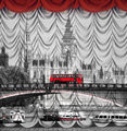 Изображение в интерьере монохромной архитектуры Лондона, с проезжающим мост красным автобусом и эффектом иллюзии штор, украсит ваш зал.