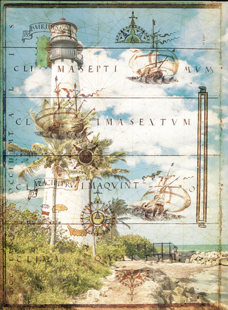 Изображение в интерьере знаменитого маяка в Ки-Бискейне, Майами, на фоне карты с парусниками и кораблями, украсит любую комнату.