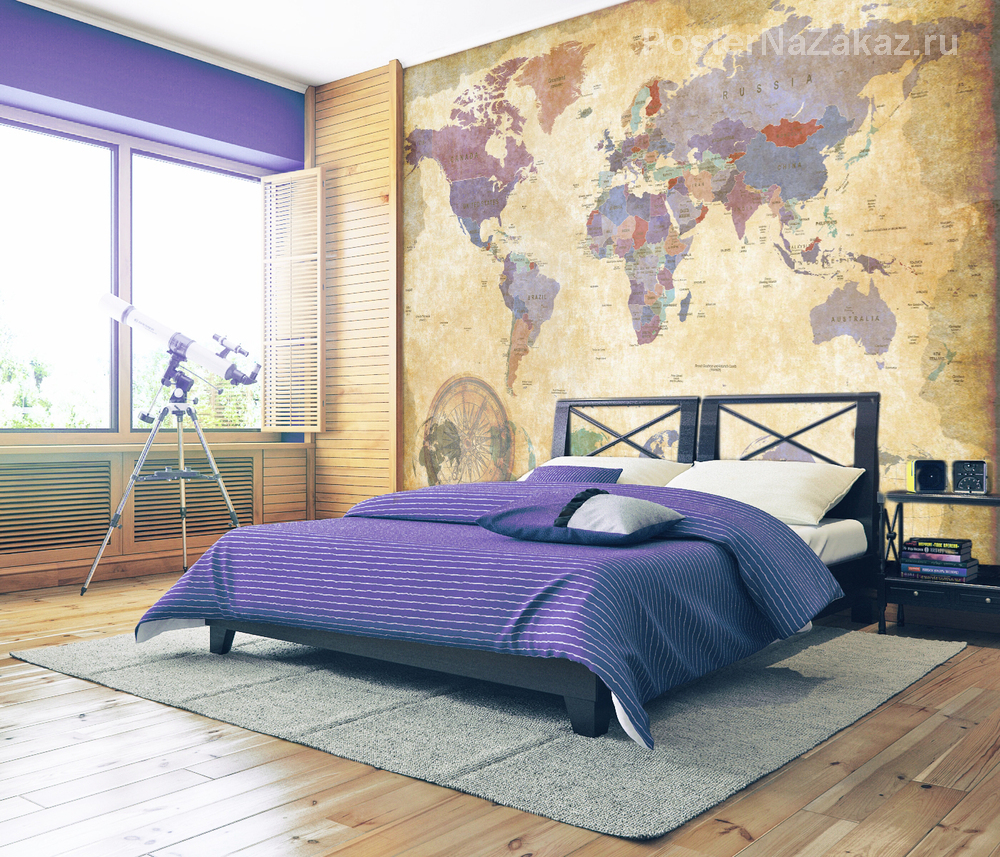 Мировая карта, изображенная в стиле винтаж, придаст стиль комнате и колорит. Подойдет для гостиных, спален и кабинетов