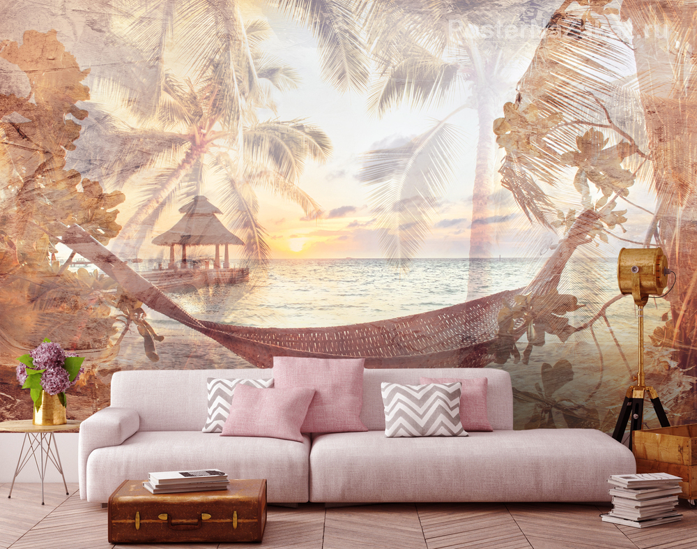 Изображение морского берега в тропиках с пальмами и гамаком в лучах закатного солнца украсит и дополнит интерьер вашей гостиной.