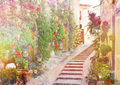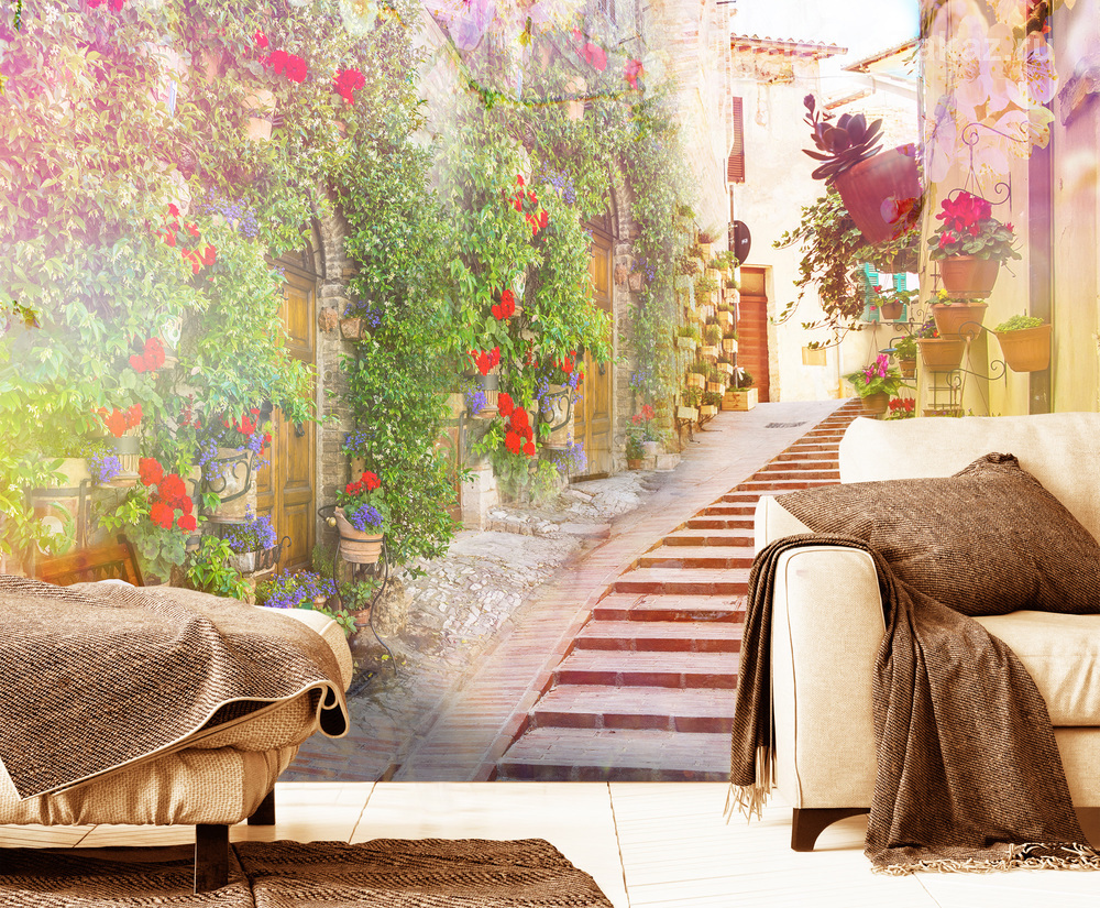 Фотообои с изображением старинной лестницы, которая окружена старинной архитектурой и цветами, прекрасное дополнение для Ваших комнат.