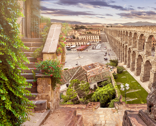 Фотообои с изображением большой цветущей террасы с видом на Древний акведук в Испании украсят и дополнят интерьер. Прекрасно подойдет для спальни и гостиной.