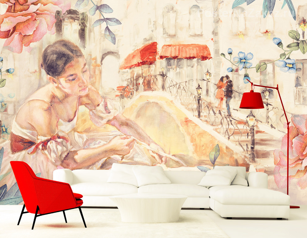 Фотообои с изображением прекрасной балерины на фоне архитектурного пейзажа Венеции в окружении цветов, выполненные в стиле живописи маслом украсят и дополнят интерьер. Прекрасно подойдет для спальни и гостиной.