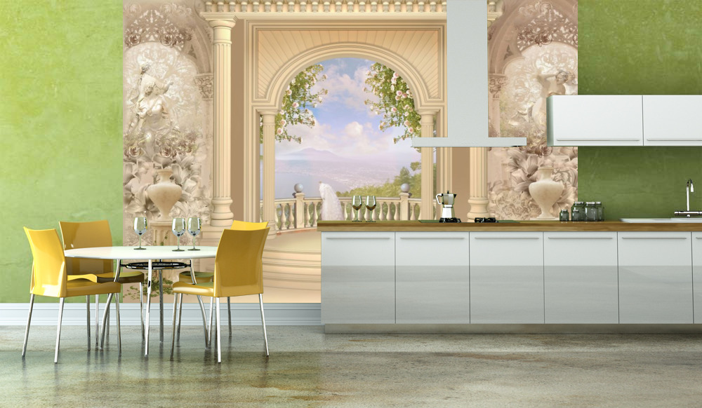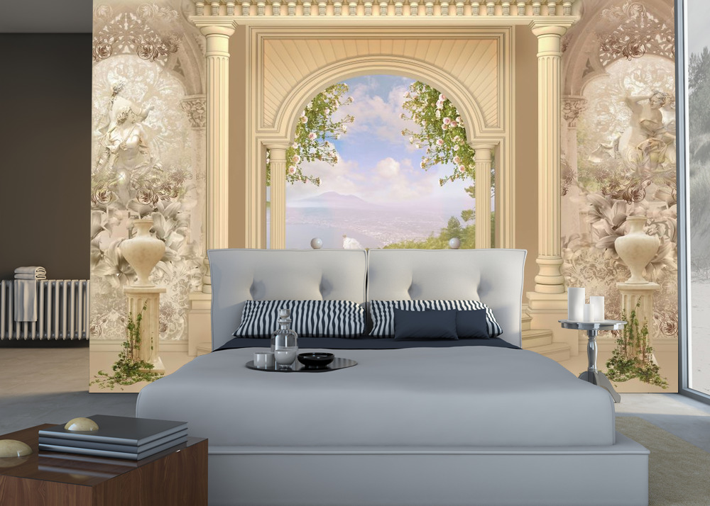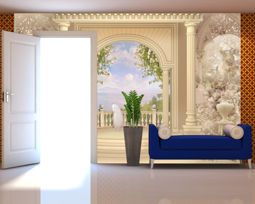 Флизелиновые фотообои с ПВХ-покрытием (виниловые фотообои на флизелиновой основе). Фактура  фреска.Материал пожаробезопасен и может использоваться в помещениях с повышенными требованиями пожарной безопасности. Плотность фотообоев изготовленных из данного материала составляет : 300 гр/м²